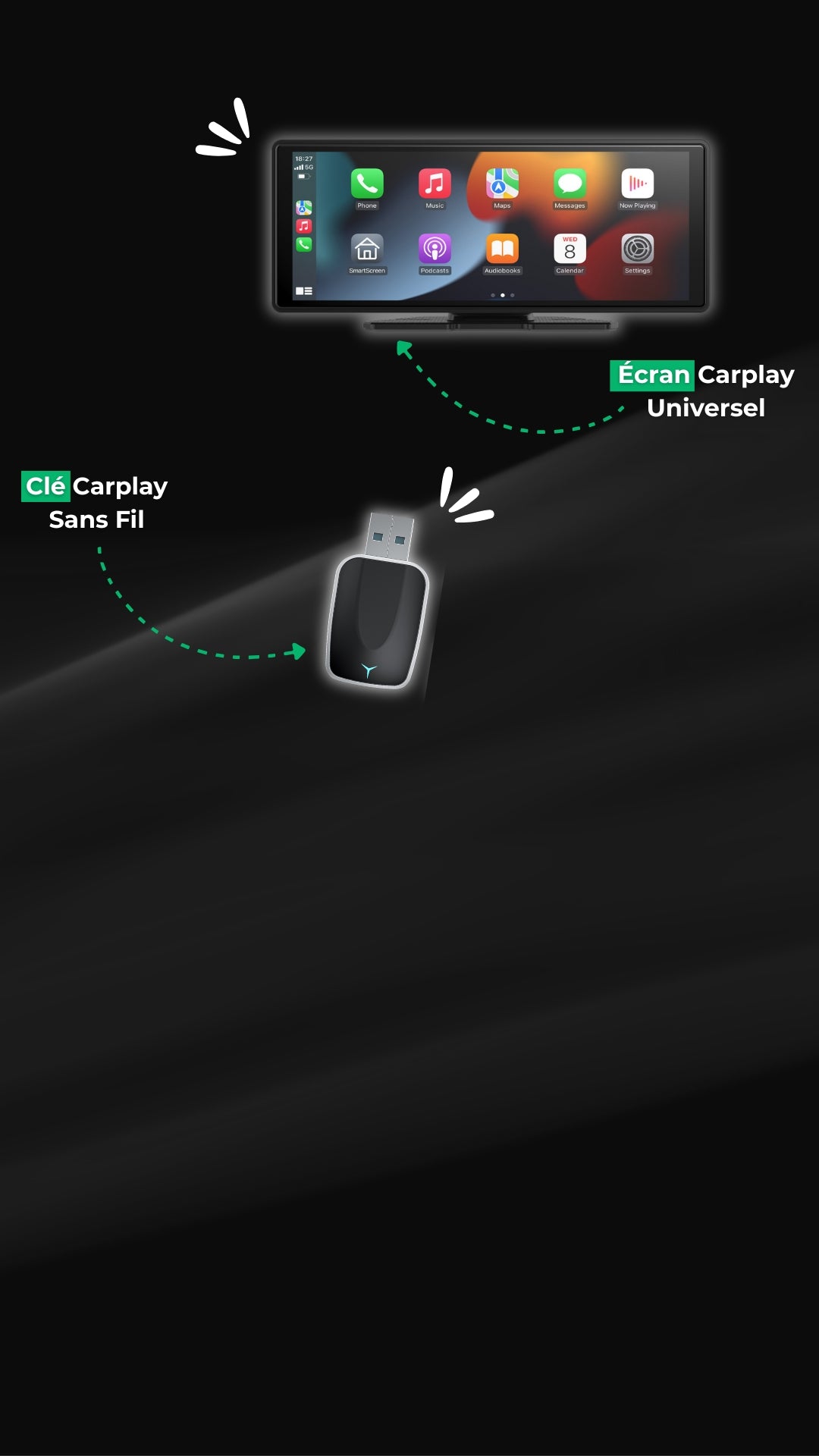 Notre Écran CarPlay Voiture vous permet d’ajouter un grand écran tactile HD compatible Apple CarPlay et Android Auto à n’importe quelle voiture, même sans carplay. Cet accessoire s'installe facilement sur votre tableau de bord.